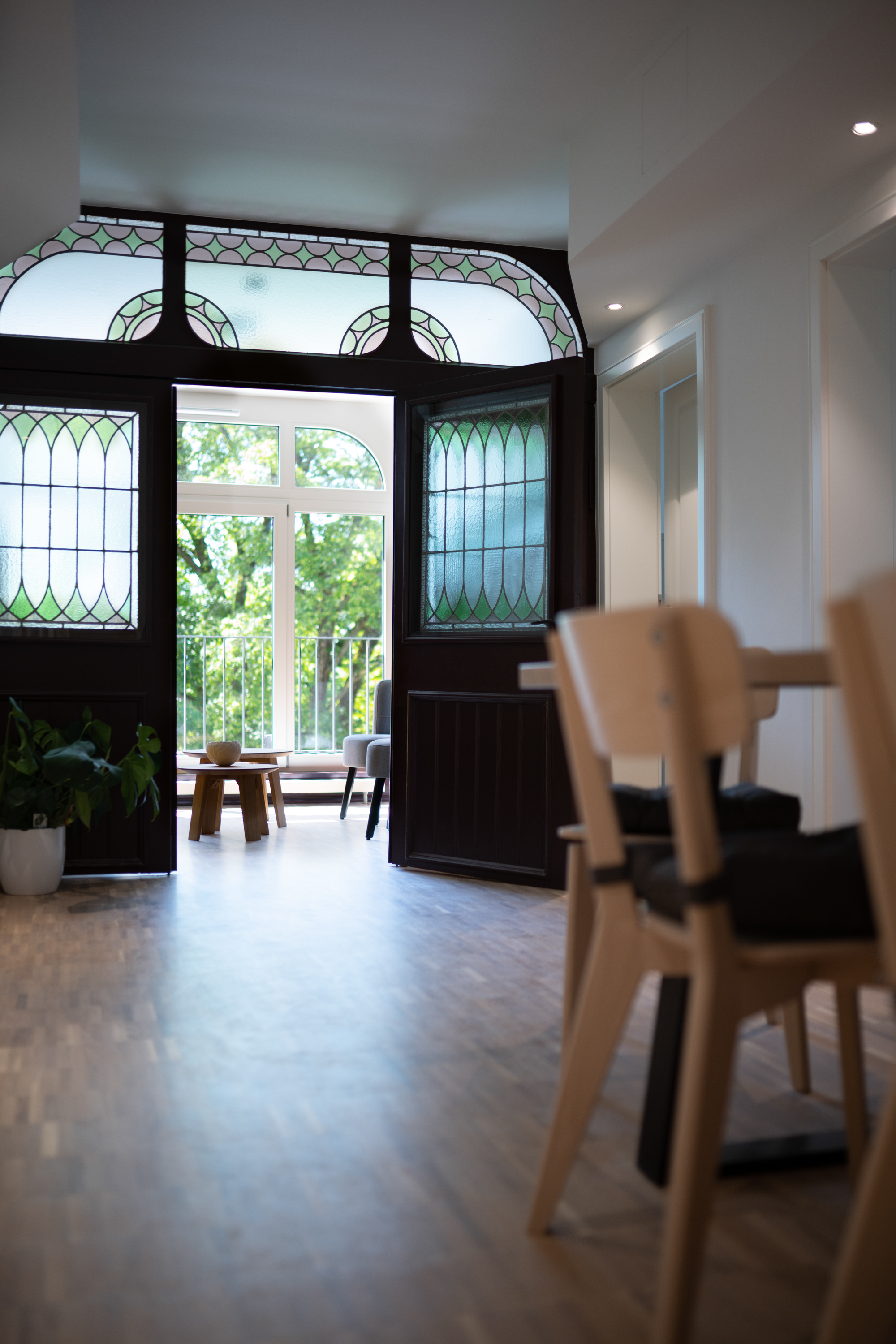 Ein großzügiger Essbereich und die daran angrenzende Loggia bilden das Herzstück der Obergeschosse. Die alten Glas-Holztüren und der Parkettboden sorgen für extra viel Charme. Alle Zimmer sind möbliert und verfügen über eigene Dusche und WC und die große Küche lädt zum gemeinsamen Kochen.